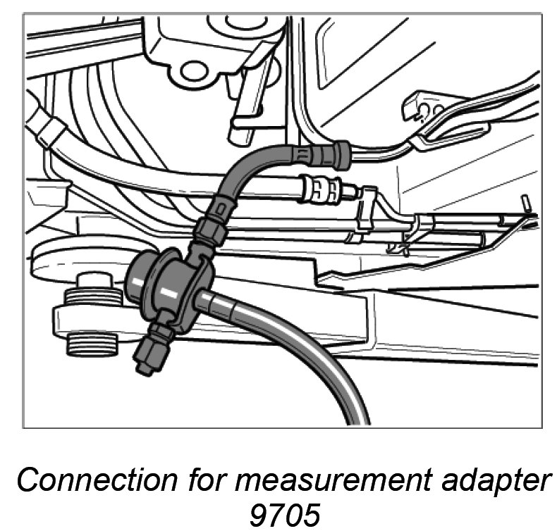13. Remove measurement adapter 9705 and attach rapid-action coupling to fuel supply line. Collect escaping fuel. Make sure that the plug-in coupling is fitted correctly (must engage audibly) by pulling the line apart.