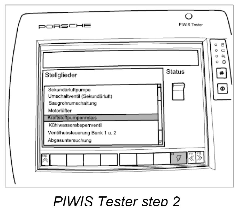 3. Connect the Porsche PIWIS Tester PIWIS Tester 9718 to the input socket in the vehicle using the adapter lead, switch on the ignition and switch off all loads, such as the radio and air conditioning. Switch on the Tester and select the vehicle (option: Diagnostics).