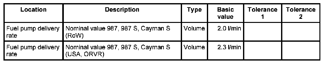 12. Pour the collected fuel into the measuring cup and compare the quantity with the vehicle-specific nominal values listed below.- Volume: 2.0 l/min ;- Volume: 2.3 l/min