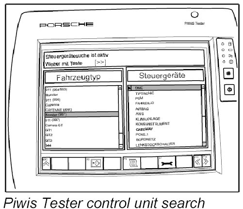 4. Run the individual control unit search for DME using the Porsche PIWIS Tester. To do this, select DME with the tracer pen and press F12 >>.