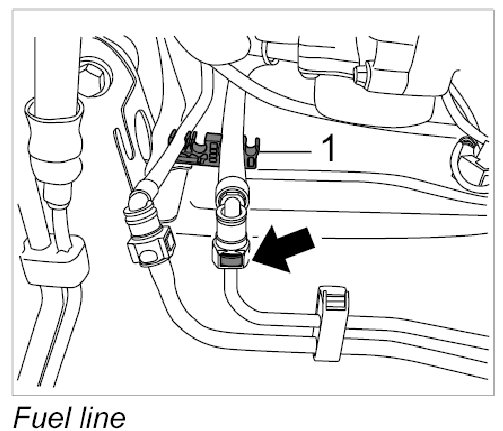 7. Disconnect rapid-action coupling on the fuel supply line -1- by pressing in the locking lug and pulling off the coupling. Clean up emerging residual fuel with a cloth, for example.