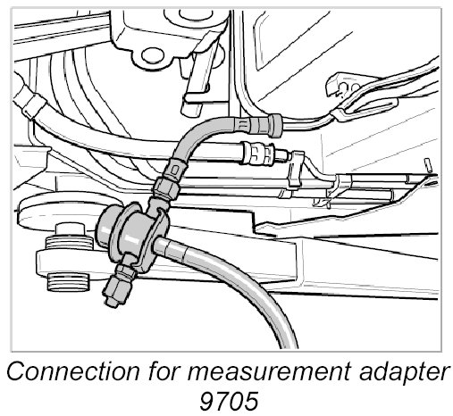 13. Remove measurement adapter 9705 and attach rapid-action coupling to fuel supply line. Collect escaping fuel. Make sure that the plug-in coupling is fitted correctly (must engage audibly) by pulling the line apart.