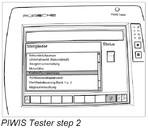 3. Connect the Porsche PIWIS Tester PIWIS Tester 9718 to the input socket in the vehicle using the adapter lead, switch on the ignition and switch off all loads, such as the radio and air conditioning. Switch on the Tester and select the vehicle (option: Diagnostics).