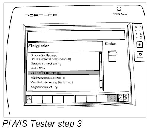 10. Activate the fuel pump relay on the Porsche PIWIS Tester. Press F8 - Start until fuel emerges at the drainage hose. Deactivate the fuel pump relay by pressing F8 - Stop and pour any leaked fuel from the container into a petrol-resistant container or into the fuel tank. Keep a stopwatch to hand for the following measurement.