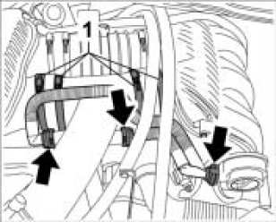1. Remove hose for oil separator. To do this, disengage and remove rapid-action couplings -arrows-.