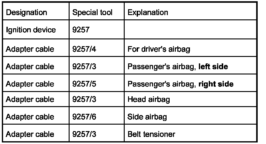 - If the vehicle suffered fire damage which caused one or several airbags or belt tensioners to be triggered, additional ignition with the adapter cable must be carried out in order to ensure that only parts without pyrotechnical contents are scrapped.