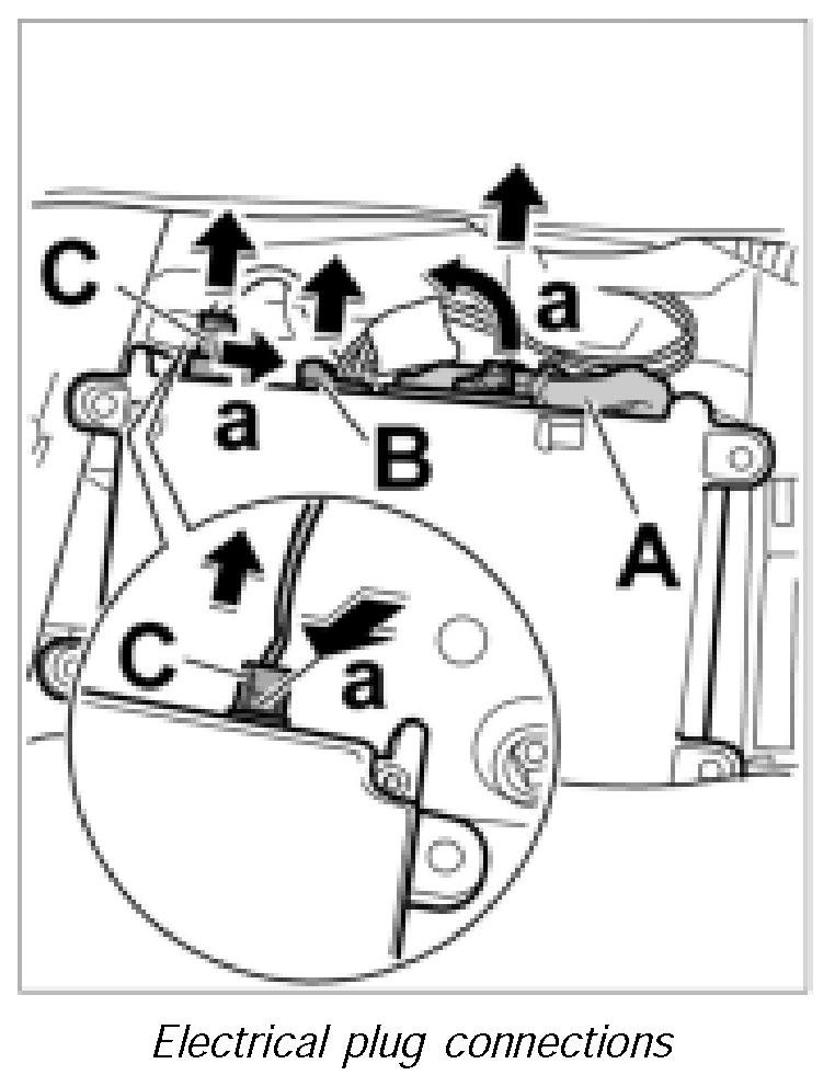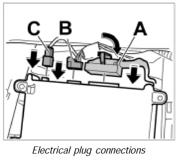 1. Push in electrical plug connections -C, B- until plugs are felt to engage.