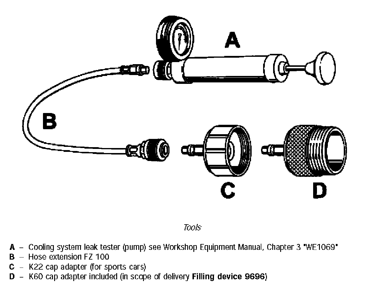 1. Check the cooling system for leaks. To do this, apply a test pressure of approximately 1.5 bar using the cooling system test device and check hose connections for leakage. The pressure must not drop.