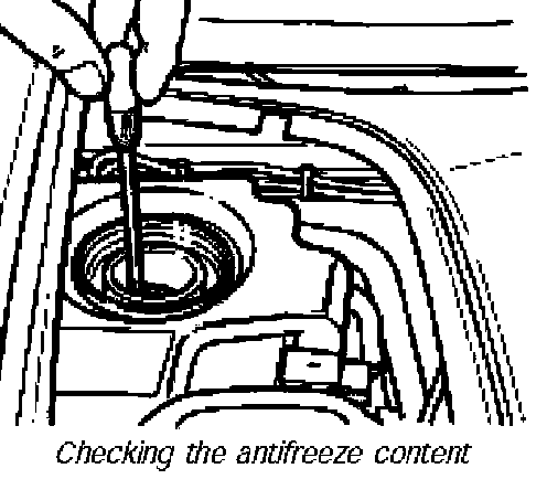 3. Check antifreeze content with a commercially available antifreeze tester. If it is lower than -37°C, it must be adjusted accordingly. The coolant level must not drop below the minimum mark.