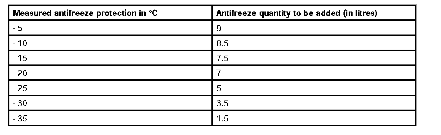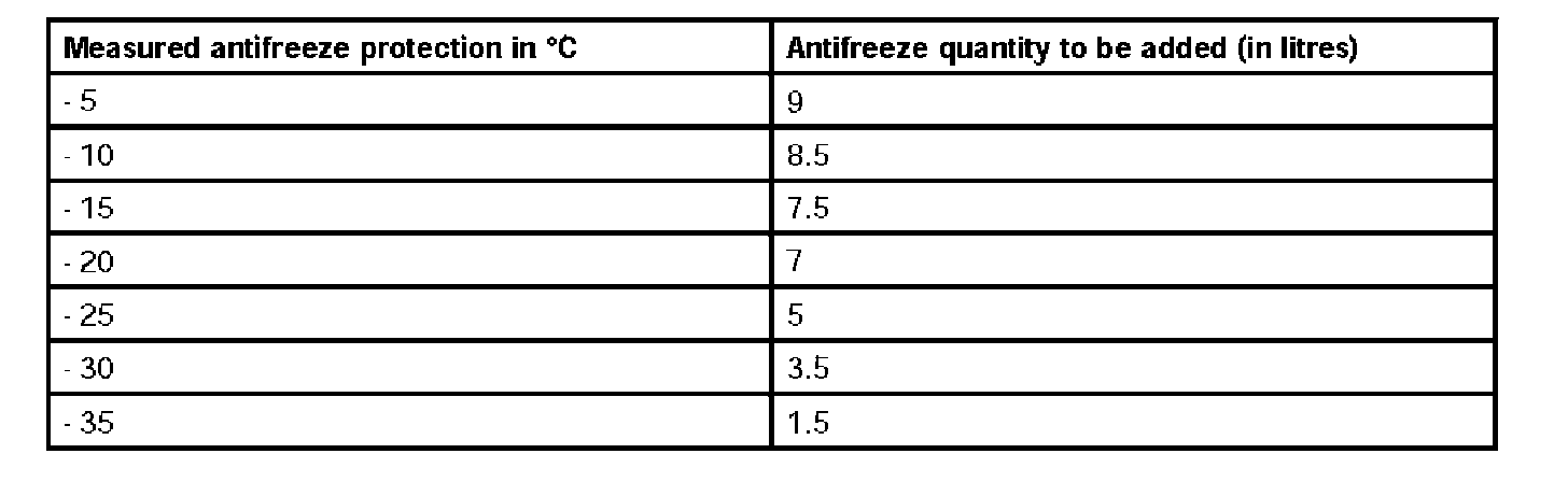 Note: The following table specifies how much coolant must be replaced by pure antifreeze in order to adjust the freezing point to -37°C.
