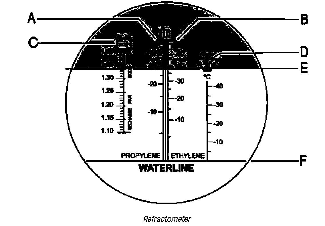 4. Using the refractometer, view against a very bright light source. A very clear light/dark limit emerges. The point of intersection between this line and the display scale marks the freezing point of the coolant.