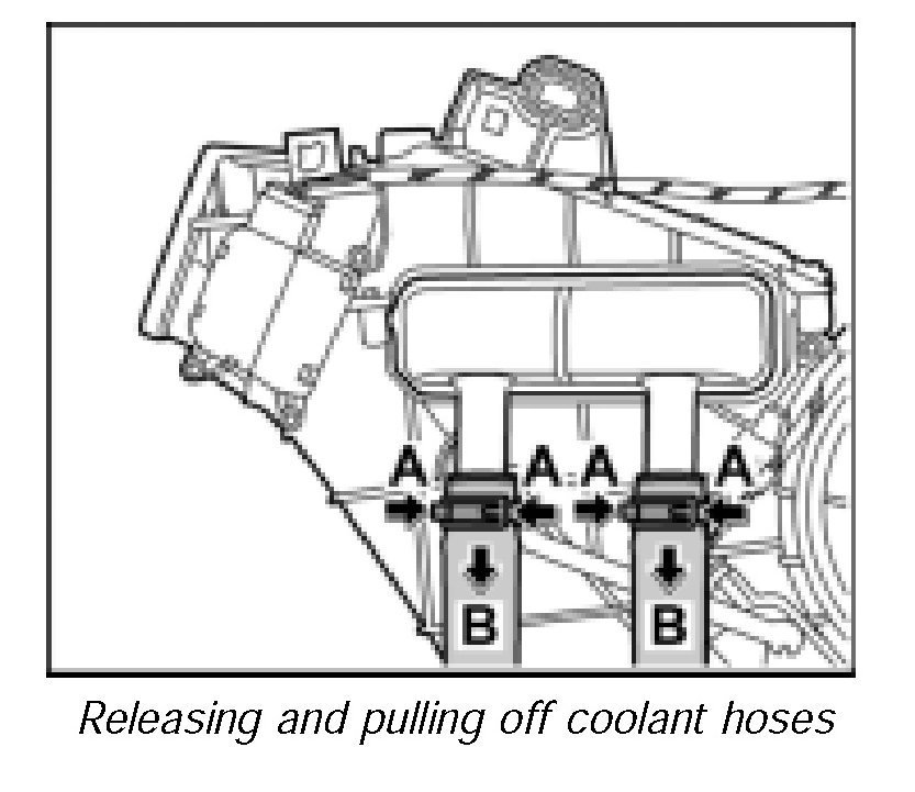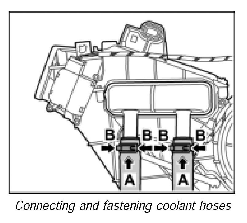 3. Push the coolant hoses onto the heat exchanger -arrows A- and attach with the spring-band clamps -B-.