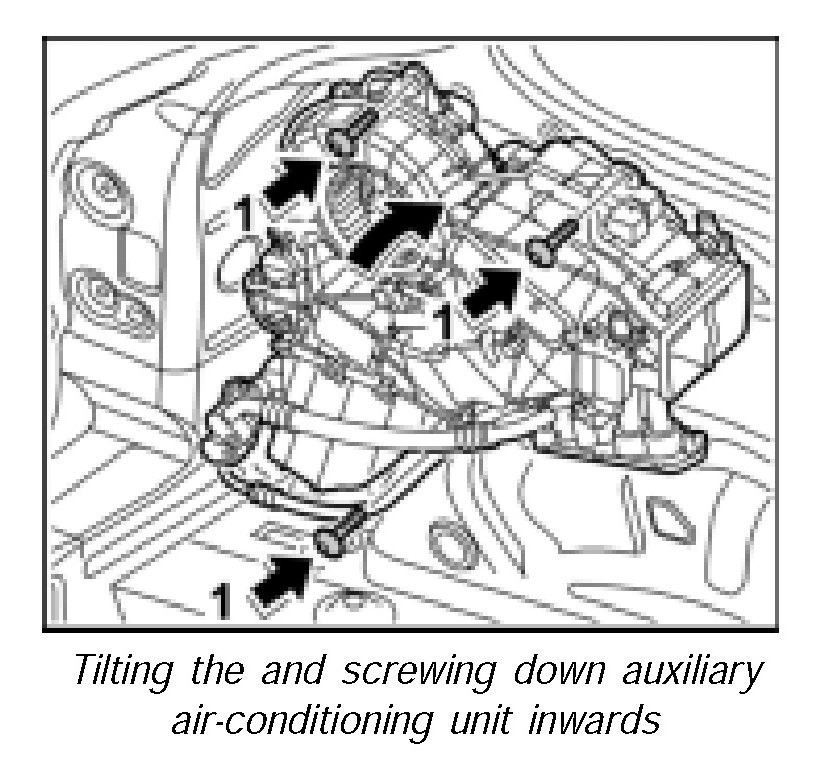 5. Tilt in the auxiliary air-conditioning unit on the top side -arrows and screw down with the fastening screws -1-. Tightening torque 6 ftlb.