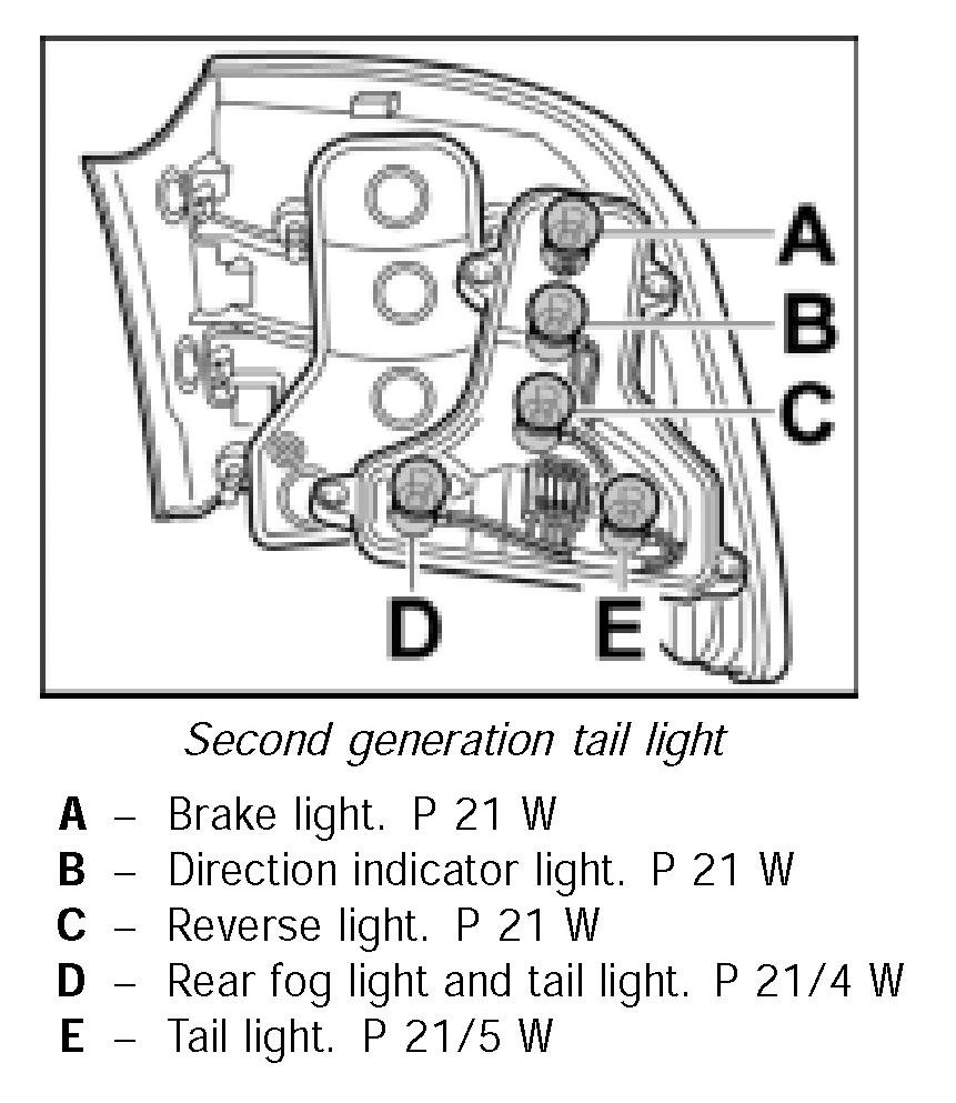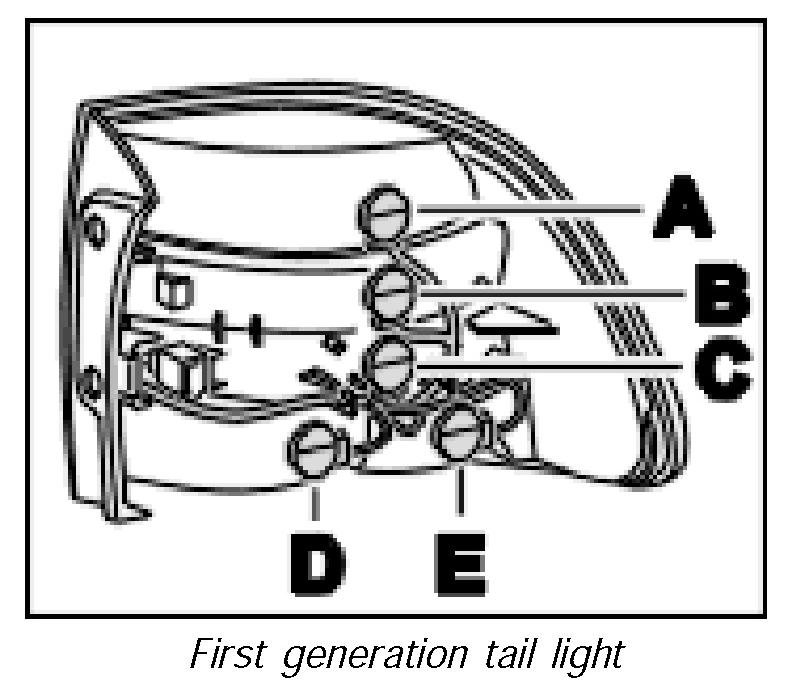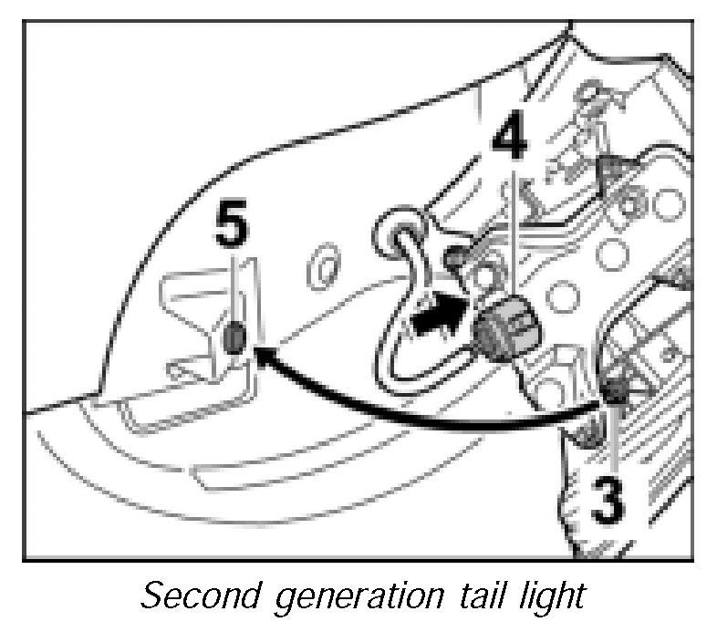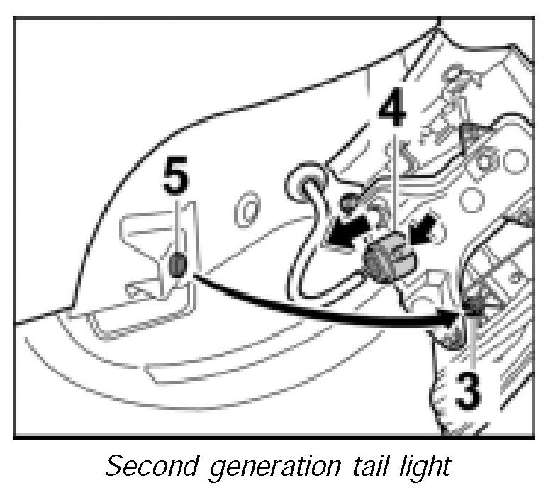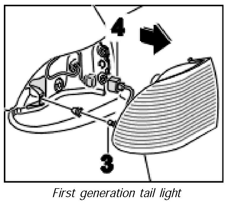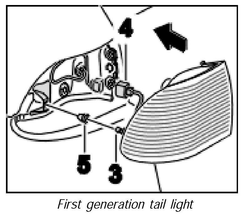 NOTE: As of January 2003, a second generation tail light is in use. When spare parts are needed, only the second generation tail light will be supplied. The tail light can be installed in older vehicles. During installation, the lead must be routed at the centre-of-vehicle side.