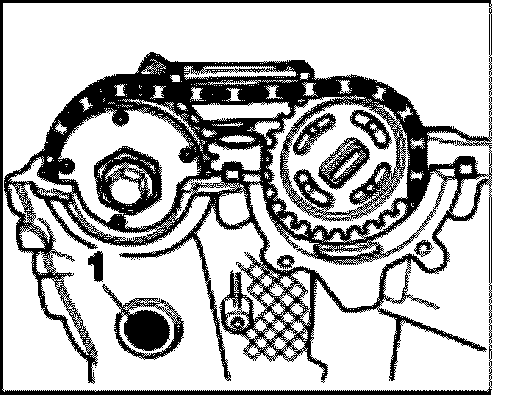 ^ The threaded bolt for guide rail 4-6 on the cylinder head (belt pulley side) -1- is inserted only after the timing chain has been fitted on the camshaft timing gears.