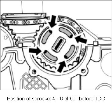 15. Fit chain tensioner, side - 6 (hexagon socket a/f 14). Fit chain tensioner with new aluminium sealing ring and tighten. Tightening Torque: 59 ft. lb.