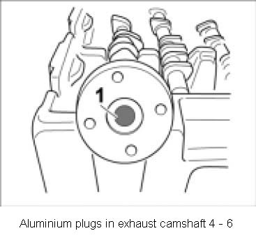 Additional identifying feature for exhaust camshaft -6: aluminium plugs with lubrication bore for tandem pump