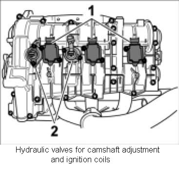 1. Insert solenoid hydraulic valves and new gaskets for the spark-plug recesses. Fit new O-rings into both solenoid hydraulic valves and insert into the bores in the cylinder head. Grease O-rings with Optimol MP3.