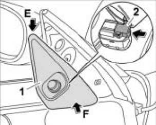 2. Hook cover -1- into the door triangle from above -Arrow E- and press into the fastening clips on the underside until it engages audibly -Arrow F-.