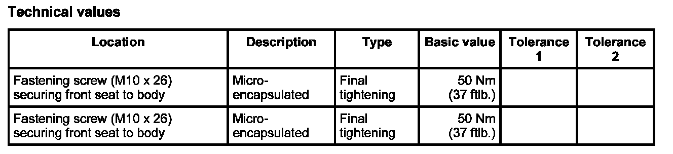 - Always replace fastening screws for the front seat after customer service and reworking.