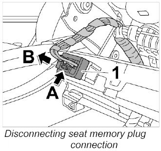 1. Release electrical plug connection -1- by activating the locking tab -arrow A- and remove from seat memory control unit -arrow B-.