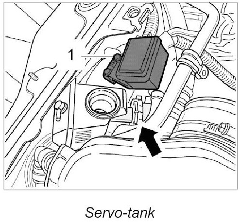 2. Release bayonet lock -Arrow- on the power-steering reservoir and remove power-steering reservoir.