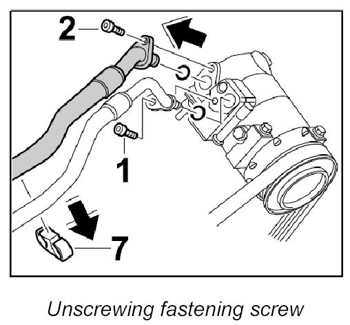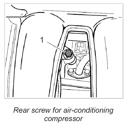 3. Unscrew rear Torx screw for air-conditioning compressor (M8 x 120) -1- between the pipes of the intake system.
