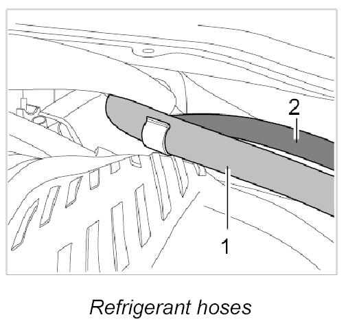 6. Unclip refrigerant hoses -1- and -2- between body and intake-air distributor.