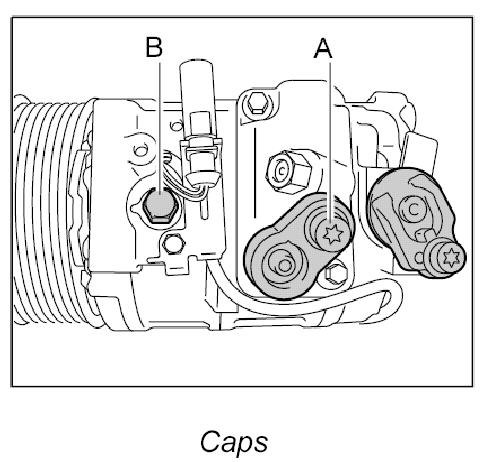 1. First, open the cap on the high-pressure side and relieve the pressure from the compressor -A-.
