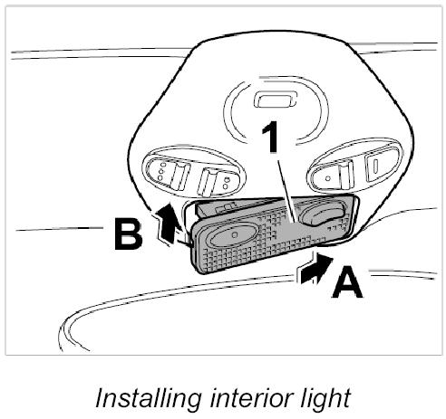 2. Insert interior light -1- into the front lock -Arrow A- and press in and up -Arrow B-.