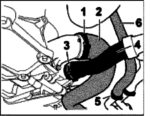 4. Remove heating hoses on underside of car -5-. Secure the pipes with hose clips and then open the spring band clamps. Remove both hoses and slowly open hose clamps. Allow coolant to drain into a clean container. Clean hoses, stick them back and attach the clips. Check that the hoses are firmly in place.