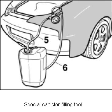 6. Place a canister with a sufficient amount of coolant and with an antifreeze content for -35°C behind the vehicle near to the expansion tank