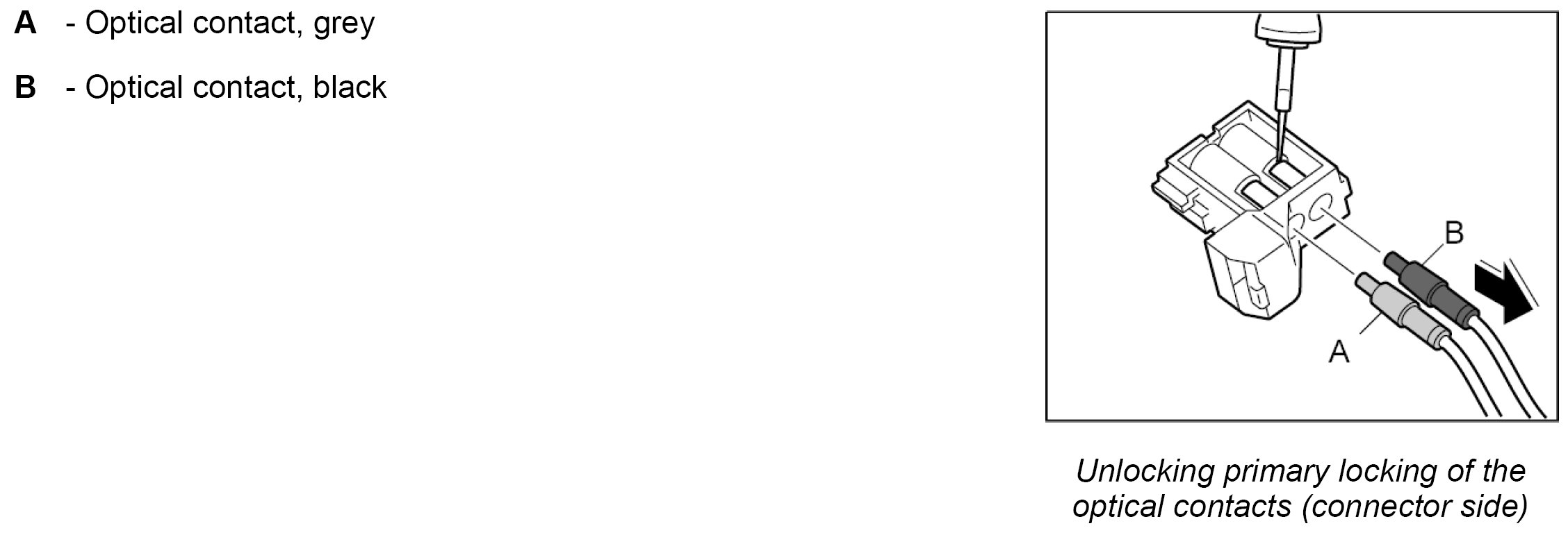 4. Carefully pull on the optical waveguide -A and B- in -direction of arrow-. If it is not possible to pull out the optical waveguide, check again if the locking mechanism is completely released.