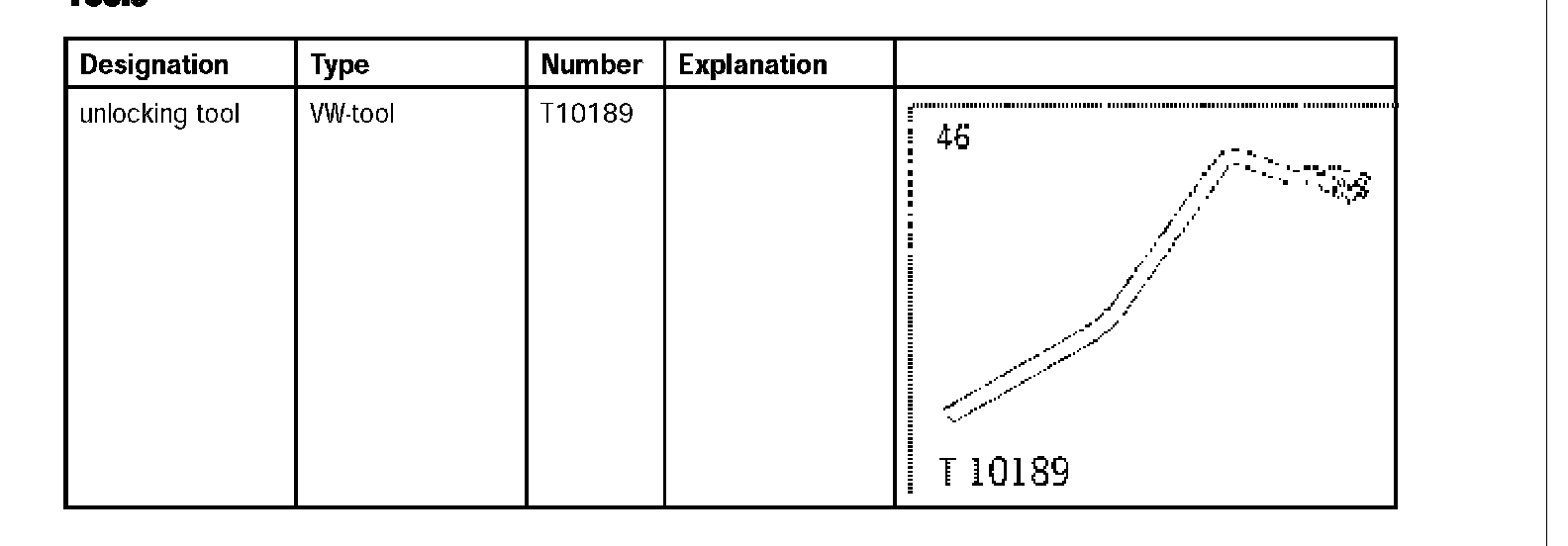 - Position the unlocking tool T10189 so that it is located in the right mould of the support and is perpendicular to the vehicle floor. Like this, the force deflection point (bending in the unlocking tool T10189) is precisely next to the screw head -arrow-.