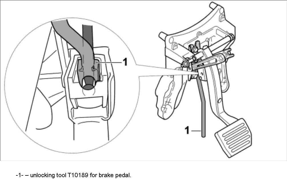 - Position the unlocking tool T10189-1- so that the fork sits in correct position in the brake pedal mounting (in the inset, the fork in contact, view against the direction of travel).