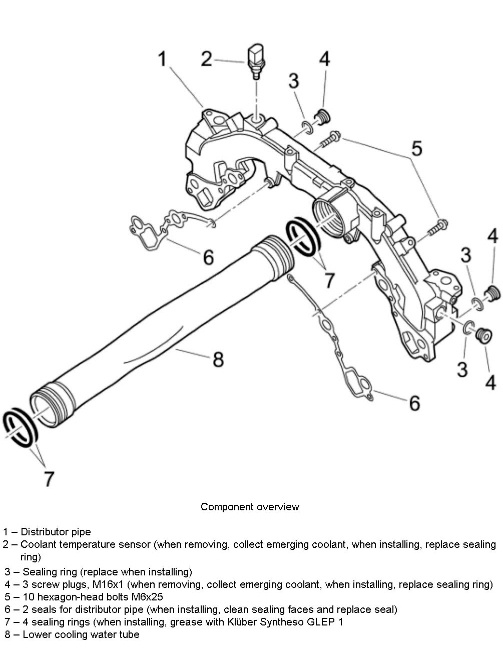 1. Clean sealing surfaces and screw in coolant temperature sensor with a new sealing ring into the distributor pipe. Tightening torque: 22 ft-lb.