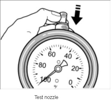 7. Remove test hose and check that the pointer falls back. Connect the test hose. The value that is displayed should not be greater than 30%. If the loss in pressure is greater, it can be assumed that the engine needs an overhaul.