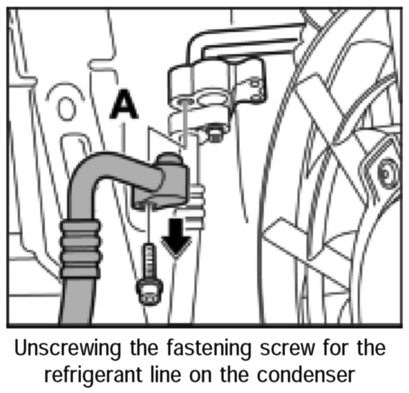 2. Unscrew fastening screw of the refrigerant line -A- on the condenser for the compressor.