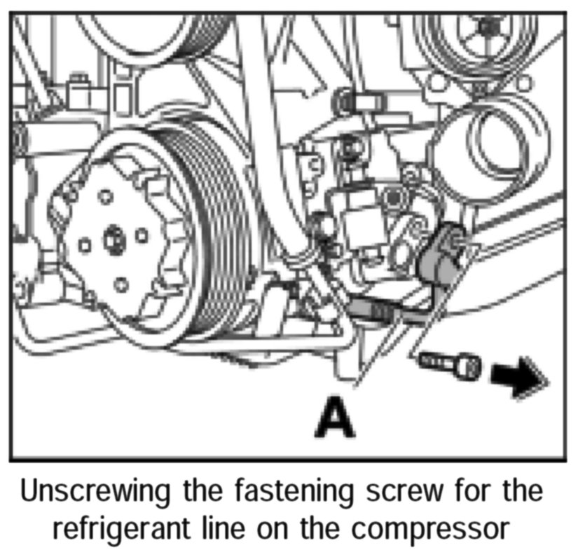 5. Pull out the refrigerant line from the compressor and remove downwards from the engine area.