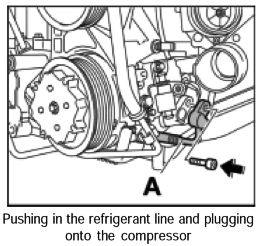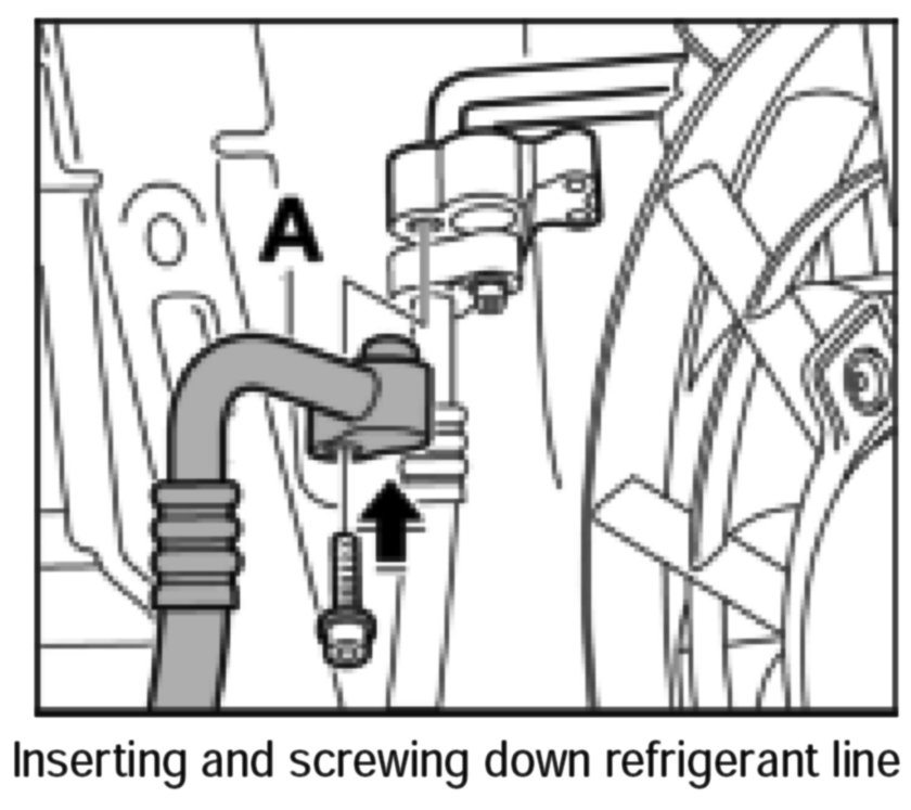 1. Insert the refrigerant line from below into the engine area onto the air conditioning compressor.
