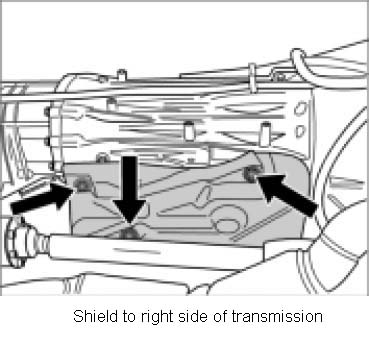 12. Install shield on the transmission. To do this, screw in three fastening screws -arrow-. Tightening torque: 7.5 ftlb.
