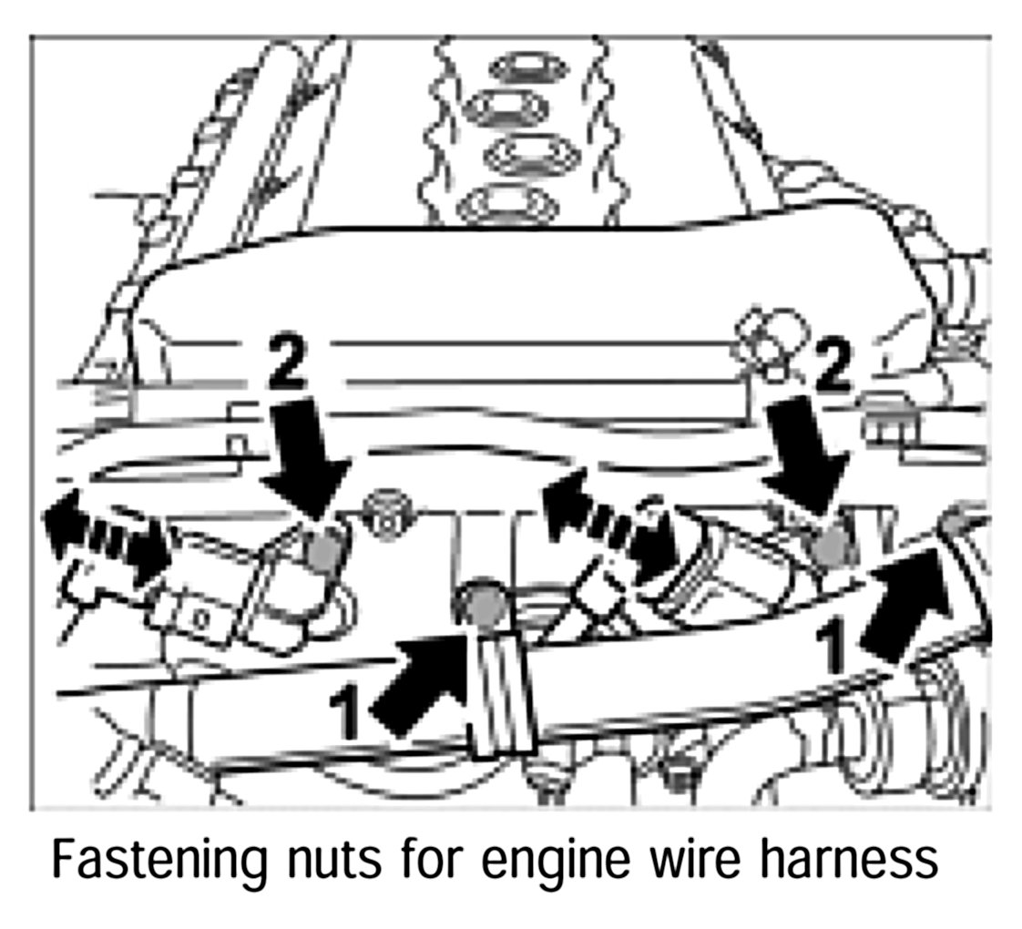 3. Unscrew the two fastening nuts for the engine wire harness on the top chain case lid -1- and push the engine wire harness to the plenum panel.
