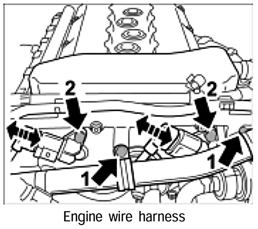1. Open both plastic clips of the rear valve cover wiring harness and lay the wiring harness aside -1-.