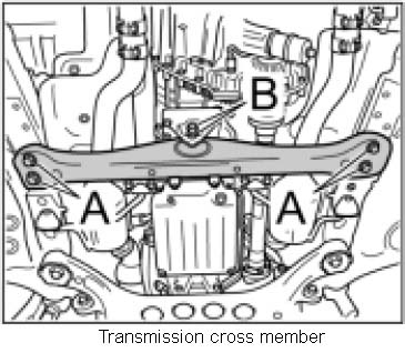 6. Unscrew four screws -A- on transmission cross member.