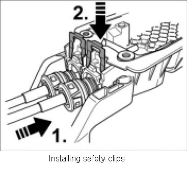 12. Remove safety clips on bottom section of gearshift bracket -1st arrow-, then remove operating cables -2nd arrow-.