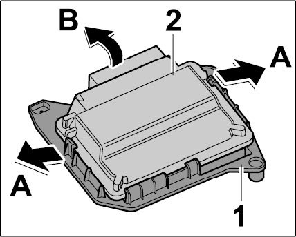 3. Release holder -1- at the two clips -arrows A-, lift up control unit for rear-differential lock -2- and slide it out -arrow B-.