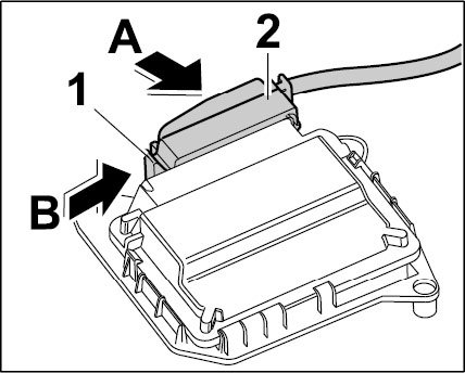 2. Plug in connector -2- (-arrow A-) and close the lock -1- (-arrow B-).