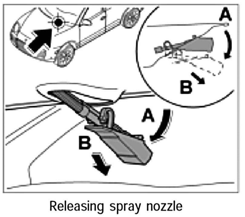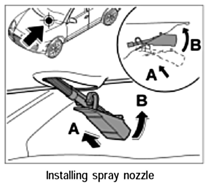 1. Insert spray nozzle along with the lines under the bonnet -arrow A- and engage -arrow B-.