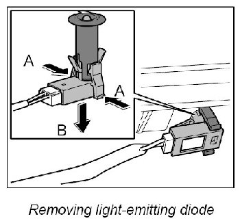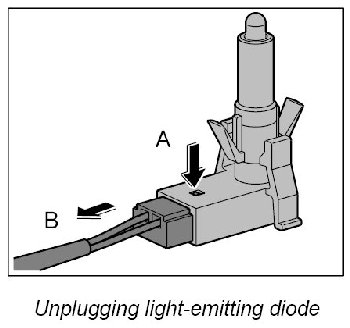 1. Release light-emitting diode -Arrows A- and pull it down and off -Arrow B-.