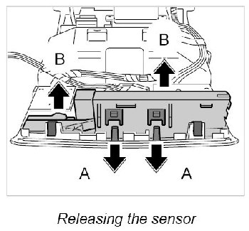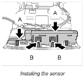 1. Insert sensor into roof console frame -arrows A- until the locking lugs -arrows B- are felt to engage. Ensure it is seated properly.